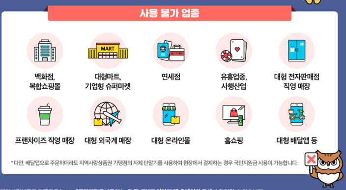 • 대표적으로 전통시장, 동네 슈퍼마켓, 식당, 미용실, 약국, 안경점, 의류점, 학원, 병원, 프랜차이즈 가맹점(편의점, 빵집, 카페, 치킨집 등) 등에서 사용 가능
