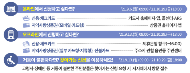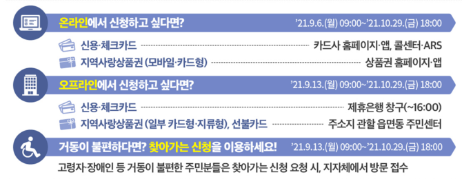 9월 6일(월)부터 주소지 관할 지자체의 지역사랑상품권 앱 또는 홈페이지에서 온라인으로 신청 가능
