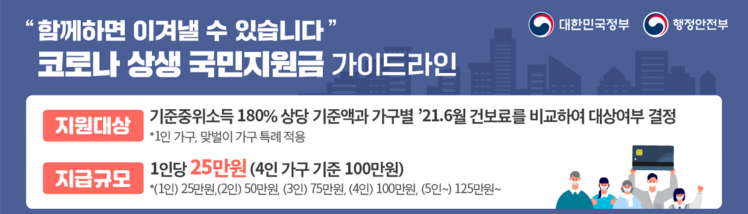 코로나 상생 국민지원금 신청 (5차 재난 지원금) 지급 규모 1인당 25만원  구분 1인 가구 2인 가구 3인 가구 4인 가구~ 지급액 25만원 50만원 75만원 100만원~ 신청 대상 소득 하위 80% 소득 하위 80% 이