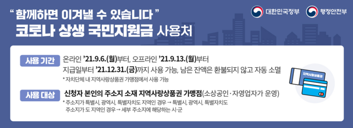 코로나 장기화에 따른 피해지원 및 지역경제 활성화를 위해 사용처 · 사용기한이 정해져 있음