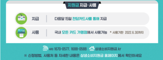 - 사용 기한 : 2022년 6월 30일까지입니다. 지원금은 지급시기에 관계없이 2022년 6월 30일에 일괄적으로 만료됩니다. 또한 사용되지 않은 지원금은 소멸되니 사용기한 내에 남김없이 사용하시길 추천드립니다.