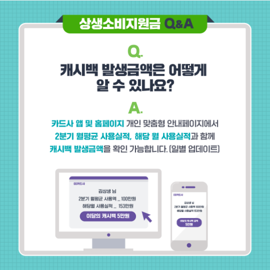 2분기 월 평균 카드사용액은 신청일을 기준으로하여 2영업일 이내 확인이 가능하고, 당월 카드사용 실적 및 캐시백 금액은 카드사용일로부터 1영업일 이후에 확인이 가능하며 하루하루 업데이트 됩니다.