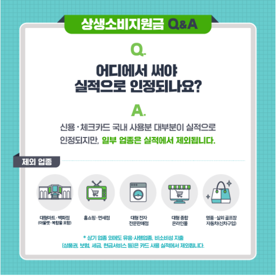실적 제외 업종은 참여 카드사의 내부 시스템에 따라 일부 차이가 있을 수 있으며 온라인, 오프라인 거래 모두 실적 적립에서 제외됩니다.