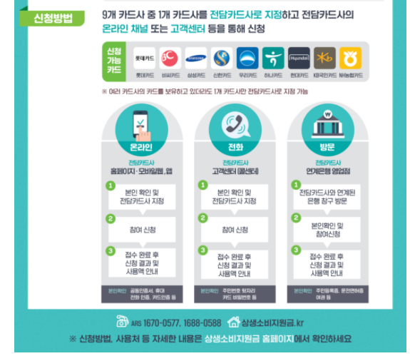 온라인 신청 채널입니다. 9개 전담카드사 중 하나의 카드사를 전담카드사로 지정하면 신청하시면 됩니다. 아래를 참고하면 해당 홈페이지로 연결됩니다.(모바일앱 가능)