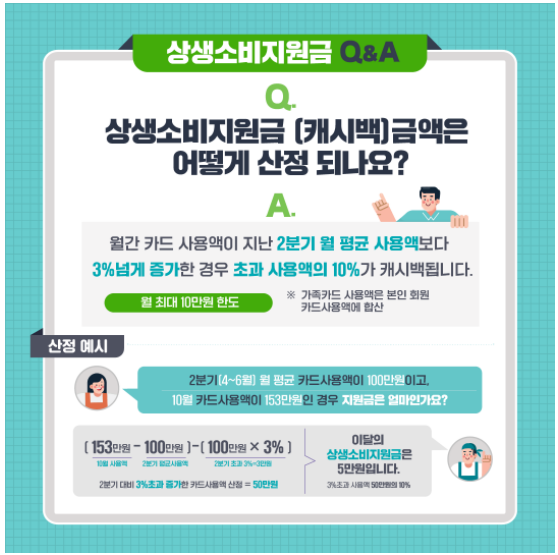 월간 카드사용액이 2분기(4월~6월) 평균 카드 사용액보다 3%가 증가한 경우, 초과 사용액의 10%를 지원금으로 산정합니다.