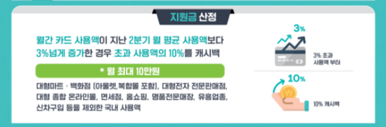 지역경제 활성화와 소비회복 촉진을 위하여 21년 2분기 월평균 사용액보다 해당 월의 카드 사용액이 3% 많이 쓰면, 초과분의 10%를 캐시백 해주는 형태이며 1인당 월마다 10만원 한도로 지원이 됩니다.